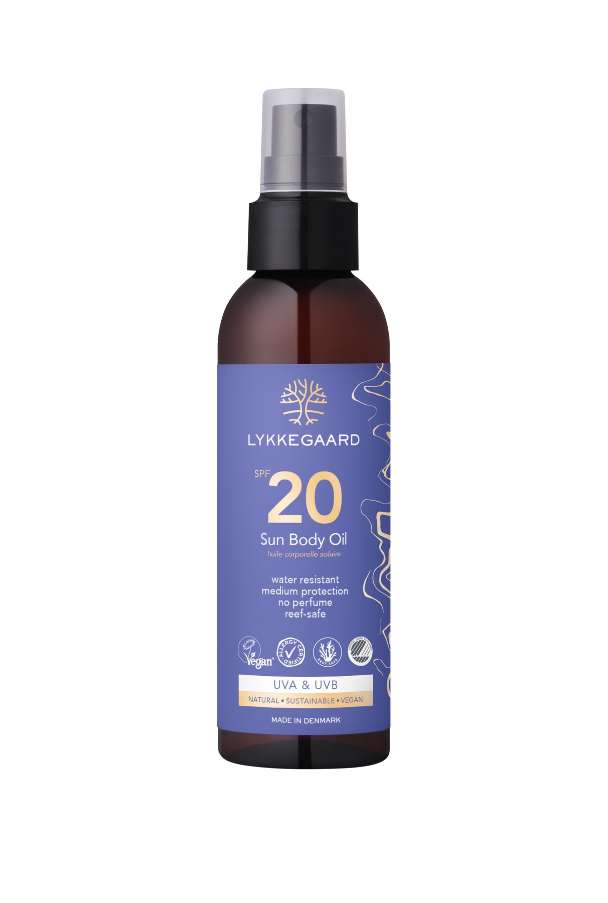 Lykkegaard Sun Body Oil SPF 20 provides water resistant sun protection. Provides medium protection from Harmful UV Rays and contains UVA and UVB.